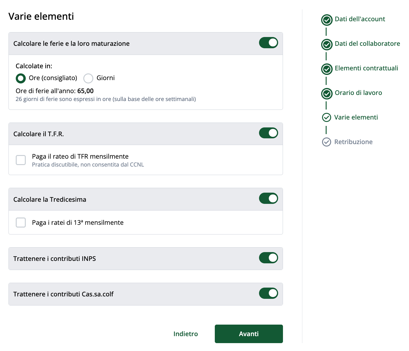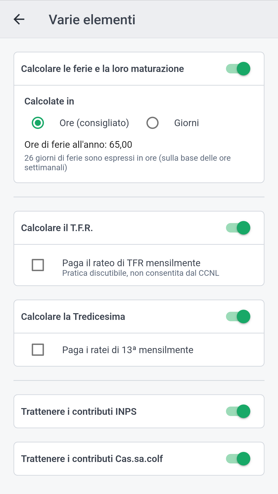Se l'opzione è attivata, i contributi Cas.sa.colf saranno calcolati e trattenuti automaticamente dalla busta paga.